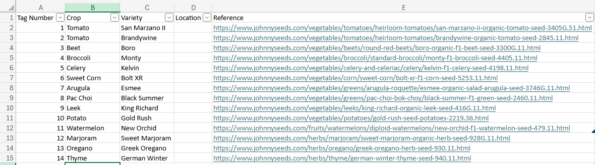The beauty of using a number code is that you can reuse the tags from year to year, you just update the spreadsheet with the current crop.