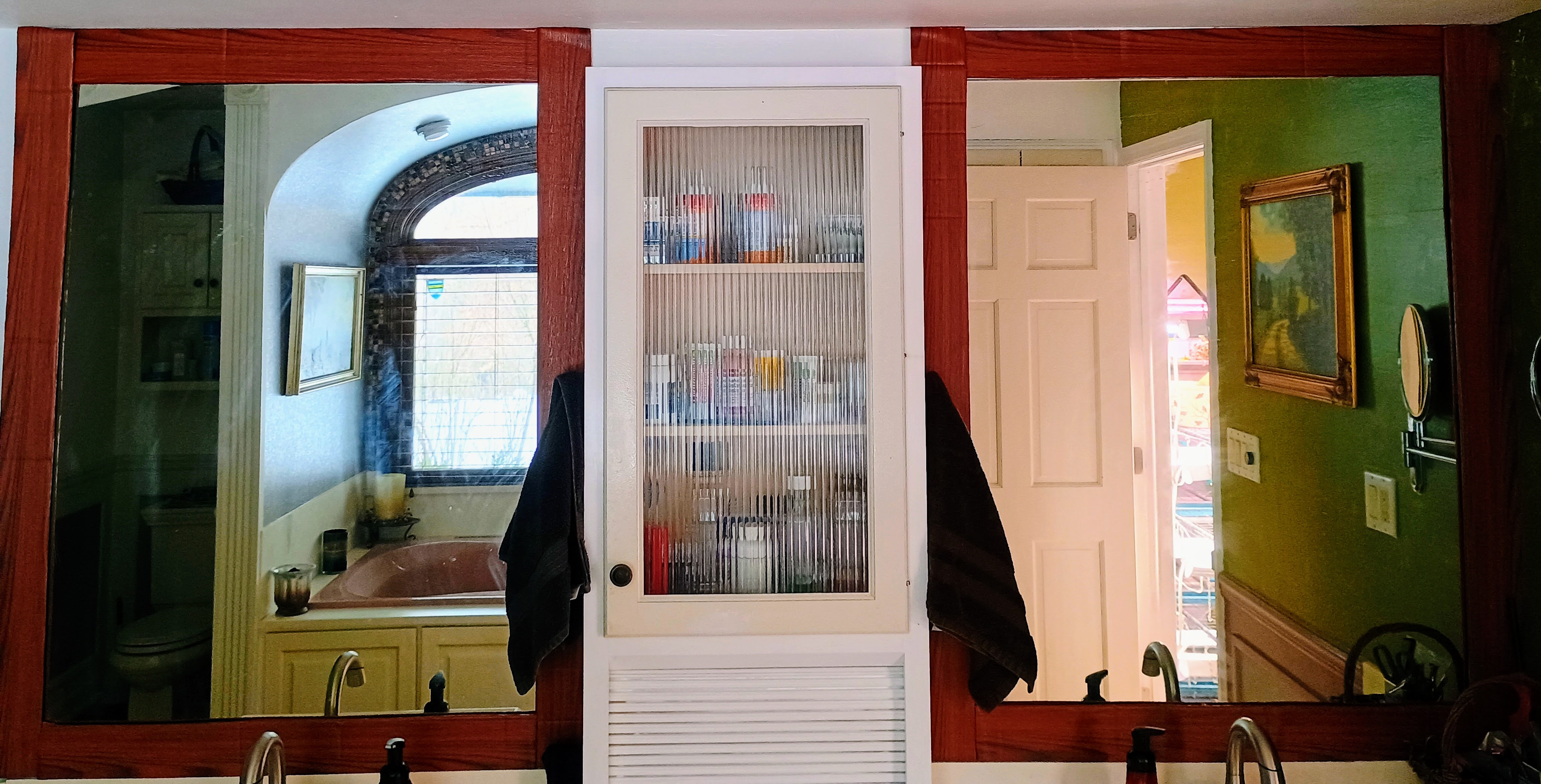We have lived here for around 18 or 19 years. Our master bathroom has undergone some changes, different flooring, wall colors, wallpaper removal, and even painting the cabinets. One thing that has never changed are the mirrors. Unframed, large, blank canvas mirrors firmly fastened to the walls. They didn’t “bother” me but they bothered me.