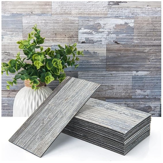 Faux Wood Subway Tiles on wall behind the toilet and sink. Plus I had some left over so I put them around the bedroom bookshelves we had added to a nook.