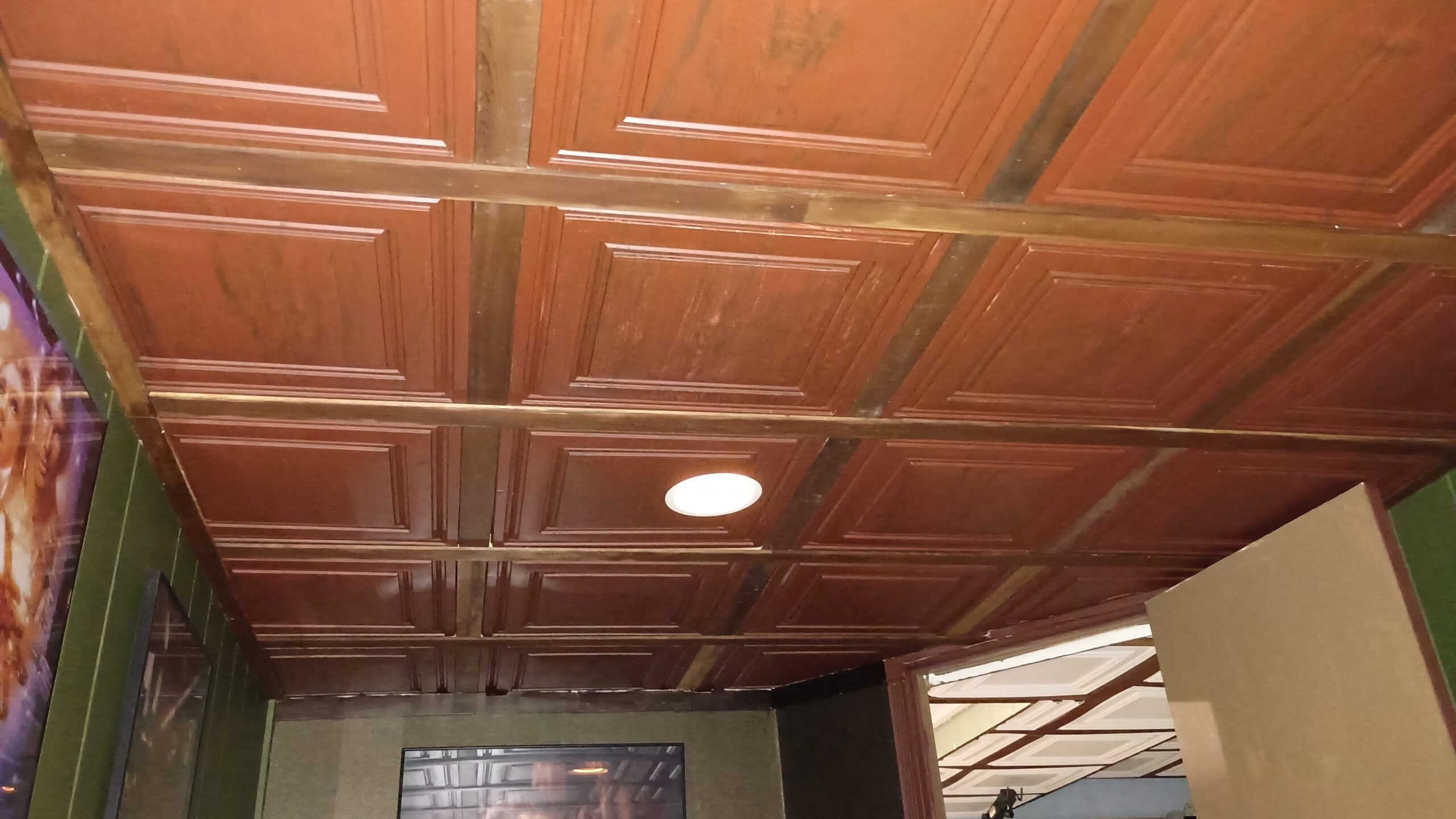 When we had that little incident with the valve in the ceiling after fixing the shower I asked myself, “Self, do you want to replace what you don’t love with more of what you don’t love?” Of course the answer was no. It would be easier, it would be cheaper, and it would be quicker but it would also be something I was not in love with. There were other tiles that had some suspicious stains on them and some that had chunks missing. I would ask how in the heck does that even happen? But I’m afraid one of my family members might answer and then I would have to deal with that information. Neither Bill nor I hated the deeper wood tones ceilings that were in there when we bought the place. We didn’t like the gaps and the wood was showing it’s age but we didn’t hate it. When we redid the ceiling in the “theater” I used acoustic tiles but I painted them maroon and then stenciled a large patterned design first in a bronze to give an illusion of shadow and then slightly offset in gold. I added stars in glow in the dark paint but that was just for fun you can’t see them till all the lights are off. The idea was to mimic the old beautiful theaters and offer some sound buffering. I still like that ceiling even though the kids are grown and we don’t do pizza and movie night down there anymore.